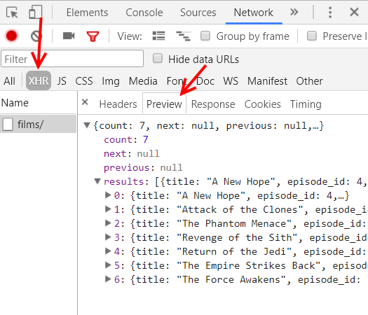 https://swapi.tech/api/films/. Assim que a resposta chegar, altere a página